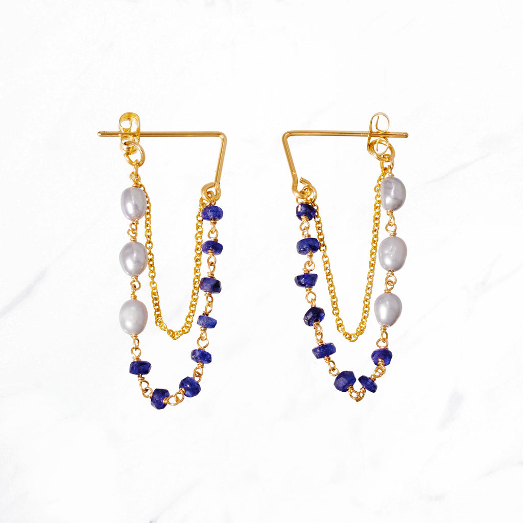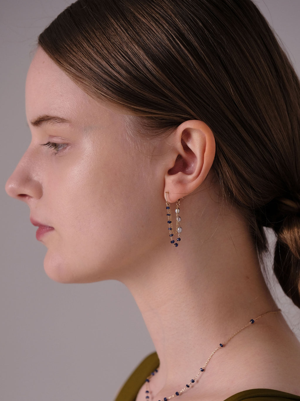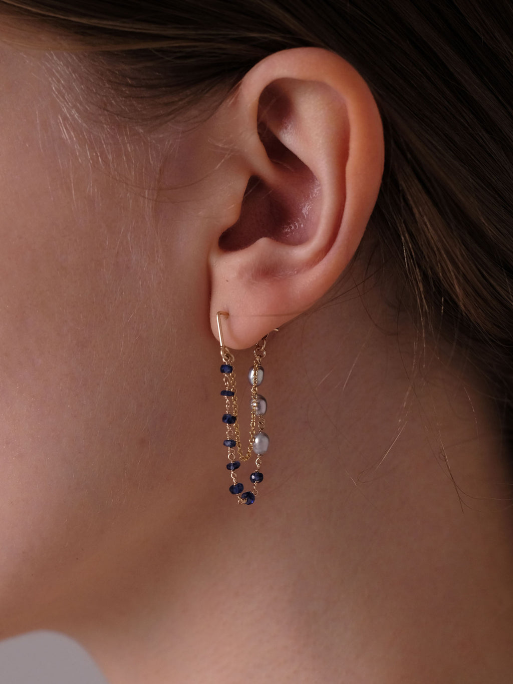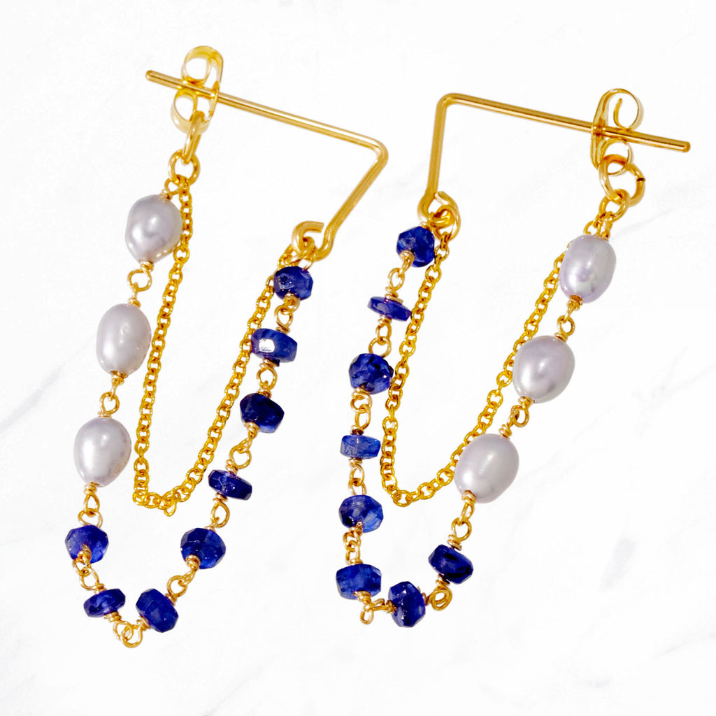These earrings feature a line of blue sapphires connected with delicate wirework, draping elegantly around the ear.Gray freshwater pearls are subtly placed at the back, adding a playful two-tone detail.