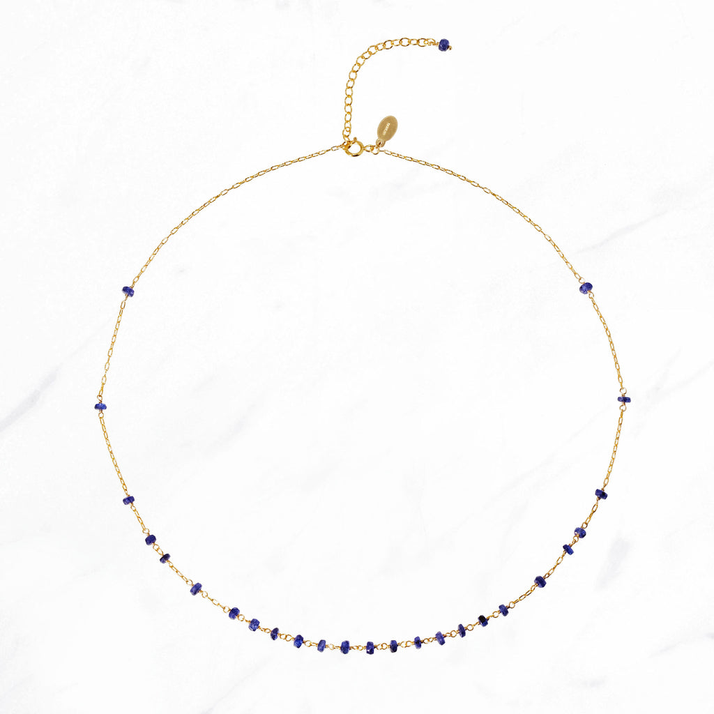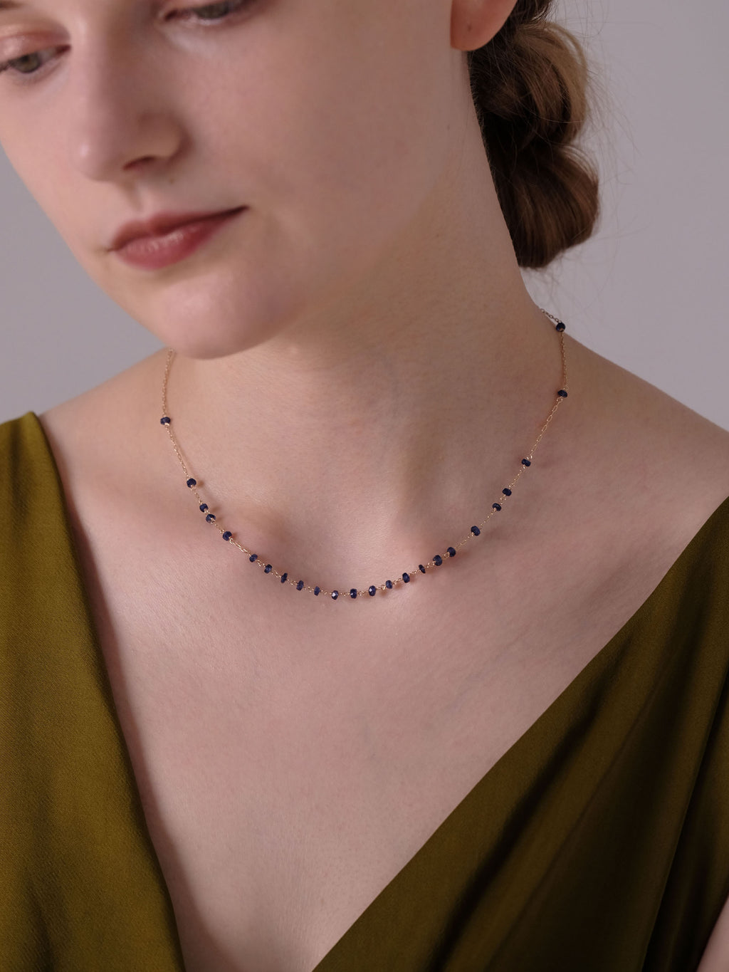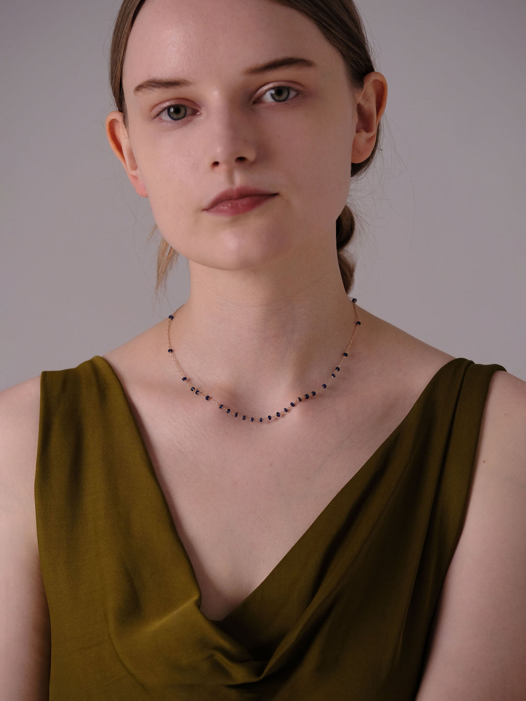 以細緻鏈條與小藍寶石節奏串接而成的短鏈。知性且沉穩的氣質,與各種造型皆相得益彰。規整而細膩的手工繞線,簡約之中蘊含優雅氣質。